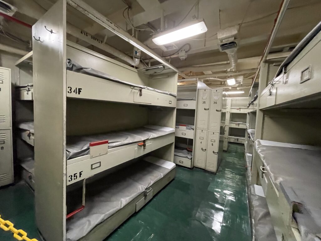 3.甲板下層 (Below Decks):迷宮般的「海上城市」只停留在飛行甲板上拍照,務必走入船艙深處的下層甲板 (Below Decks),這裡才是『海上移動城市』的靈魂所在。穿梭在如迷宮般的狹窄走道間,你將親眼見證當年 4,000 多名水手的真實生活:從供應萬人伙食的巨型廚房 (Galley)、擁擠壓迫的士兵臥鋪 (Berthing),到設備一應俱全的海上醫院 (Sick Bay) 與禁閉室 (The Brig)。這種充滿生活感與幽閉氛圍的體驗,能讓你深刻體會海軍服役的艱辛,是比戰鬥機更真實的歷史衝擊。」