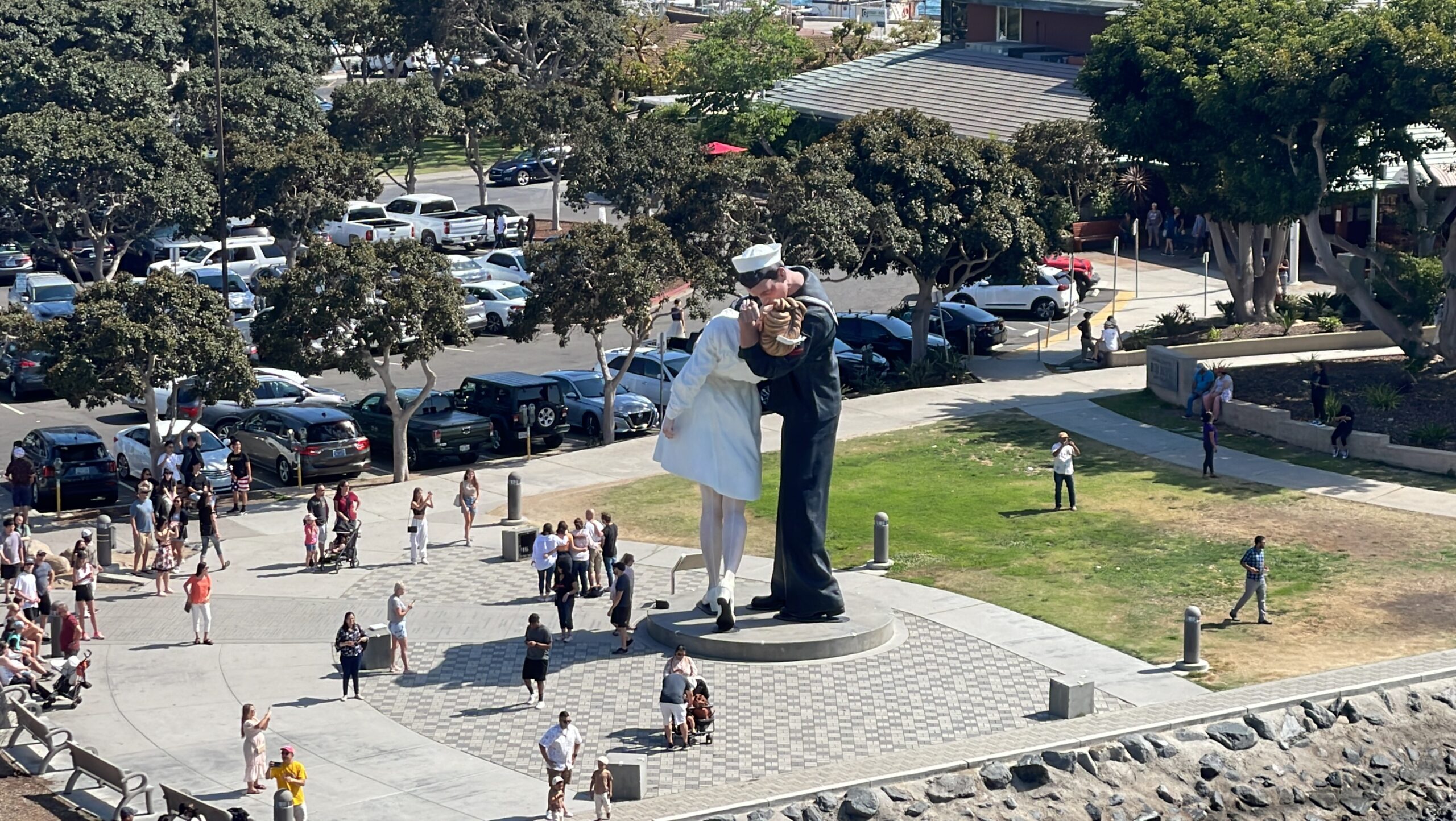 4.勝利之吻 (Unconditional Surrender): 離開博物館後,別忘了在旁邊巨大的「勝利之吻」雕像前留影。這裡通常遊客眾多,建議利用低角度仰拍,避開雜亂的人群。